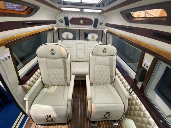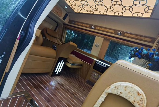 一般改装项目清单(包括但不限于):航空座椅、三连座沙发、柚木地板、全隔断、带升降电视、半隔断吧台、吧台隐藏座椅桃木方向盘、方向真皮包、覆仪表台真皮包覆、驾驶座真皮包覆、驾驶座电动调节、驾驶座电动加热、驾驶座电动通风、驾驶座电动按摩、驾驶座气动按摩、驾驶座加棉、驾驶舱鹿皮顶、后舱鹿皮顶、后舱星空顶、九宫格顶灯、ABCD柱鹿皮包覆、遮阳板鹿皮包覆、驾驶位门板真皮包覆、中门门板真皮包覆、后尾门门板真皮包覆、全车侧壁真皮包覆、全车私密手动窗帘、迎宾踏板、主副驾驶中央扶手箱、主副驾驶扶手带冰箱、吸顶电视、主副驾驶靠背小桌板、可拆卸小桌板车、内氛围灯、吊顶、等其他项目。