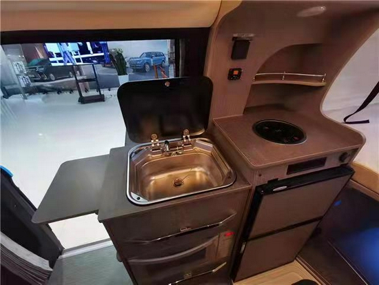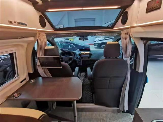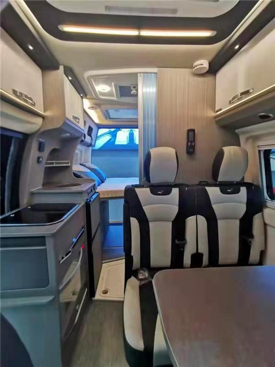 进入车内我们可以看到,我们是2+2的座椅布局,因为B型商旅空间区别于C型房车,所以人员荷载较少,当然也是可以定制5座的。生活区我们配备一整套的设备方便我们日常使用,电视以及音响的设计是为我们的影视感受而设计的,厨房区域我们配有800W的电磁炉、带盖水槽、延伸桌板、以及我们60L的冰箱完全满足我们的日常烹饪需要。