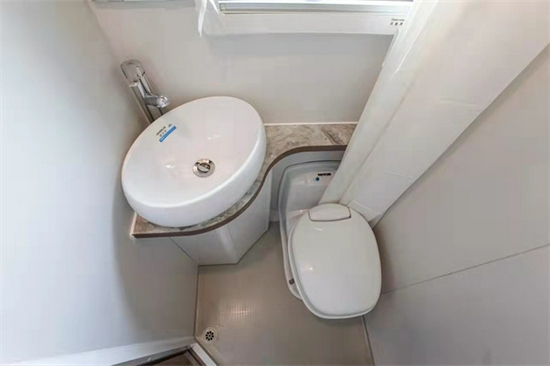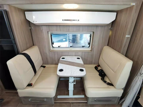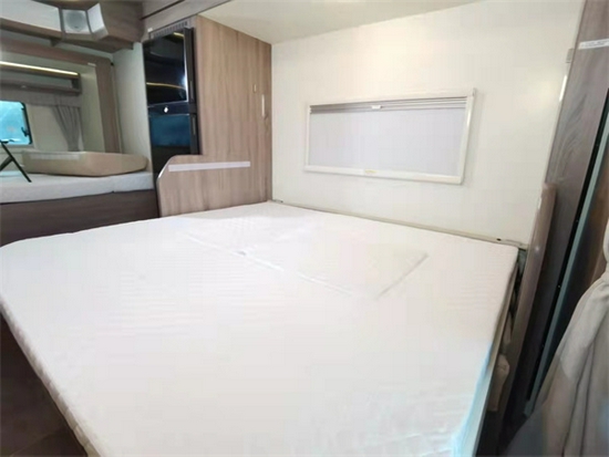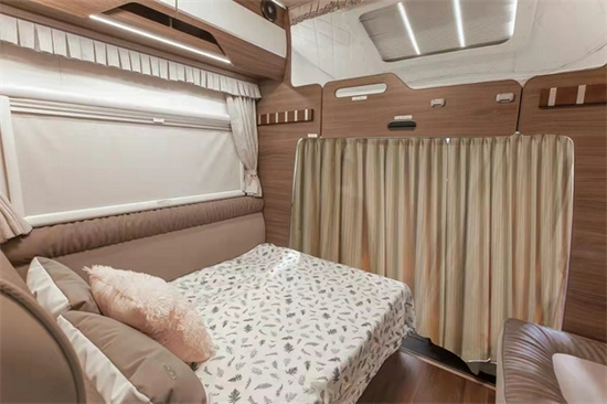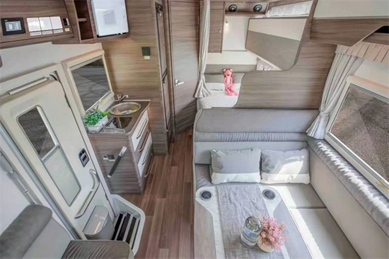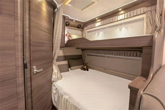 这款车型本人还是比较喜欢的,很多客户不喜欢太大的车型,那无拓展都是挑选车型看中的重要因素,特别是出行人数较多的,这款虽然没有在整体的空间感上稍逊双拓展,但是在布局上应用很合理。一方额头床,尾部纵置上下铺,再加上L型沙发卡座的拼床,总体来说,在无拓展车型中可睡下5-6人,真正满足的了一家多人出行的乐趣。