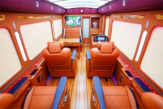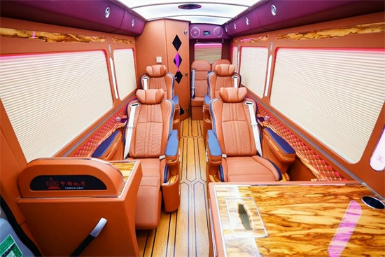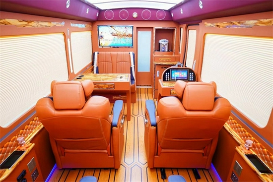 10座的考斯特可以称得上豪华舒适型的了,部分座椅可260旋转,并快速组成会议模式,第三排的沙发床能随时随地的休息,在整体额布局以及选材用料方面都体现出对乘坐者的贴心关怀。地板上的改装基本都是以木地板为主,至于花纹装饰方面更是有多款色彩以及纹路可供参考。 至于车内整体环境而言,隐私帘以及势必可少的,这么大的空间,偶尔车内谈谈事情,谈谈合作,一个隐秘,安静又稳定的环境就此产生,商务这一块的功能性体体现的十分贴切。