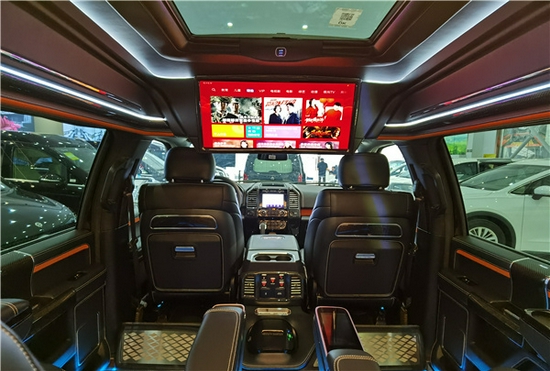正副驾驶座椅后方配备了办公小桌板,满足出行中的办公学等需求。上方采用了半隔断互联网电视,搭配全车索尼的音箱,带来了很好的娱乐体验及视听感受。下方配备了空气净化器,保证了车内的空气质量。侧墙部分除了纳帕真皮包覆还有着大量氛围灯的点缀,以及镀铬涡轮出风口格调十足。
