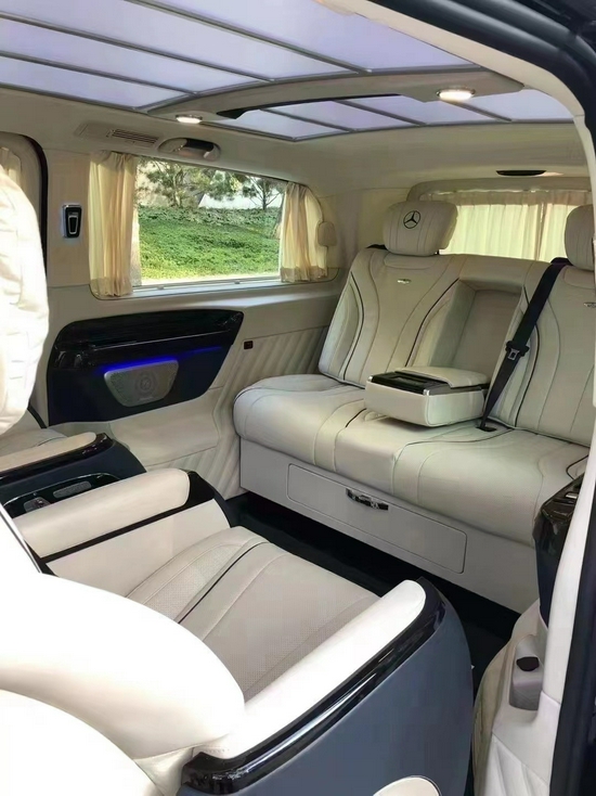 内饰通过改装实现了满足商务接待、洽谈、出游等各种出行需求。全车真皮包覆质感十足。然后它的第二排的座椅也达到了飞机头等舱的标准,手感细腻的进口纯手工真皮包裹,配有精致缜密的缝线,细节之处随处可见。不仅看上去更有档次感,而且在您坐上去之后就能感觉到它完美的衬托感!还具有多向电动调节等功能!它不仅可以让乘客更好的休息,也还可以和后排的人一起下棋或者打麻将,因为这个座椅可以旋转到后方,这样就可以轻松的娱乐了,座椅具备了通风和加热、按摩、记忆功能,整车配置强大,说不出一个不好的理由。