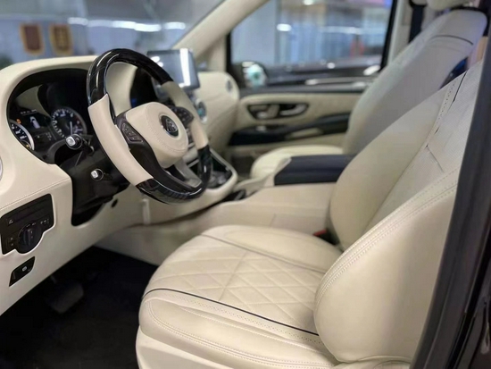 奔驰威霆无隔断改装,做工精致布局合理,内饰风格简约大气。全舱座椅采用进口nappa真皮制作,正副驾驶座椅后面都设置一个折叠式小桌板,可娱乐或办公,设计很人性化。多功能按摩座椅可前后电动滑动,腿托可电动打开,缓解腿部疲劳!亦可以旋转成面对面的交谈模式,更方便家人间的交流或者商务的洽谈。