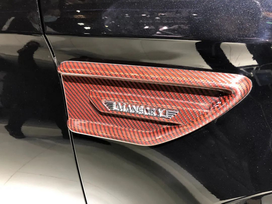 侧身鲨鱼鳍扰流采用红线碳纤打造,中央内嵌亮银色MANSORY飞翼标识不仅增强了立体层次感,更能凸显出MANSORY“全球碳纤之王”的品牌魅力。