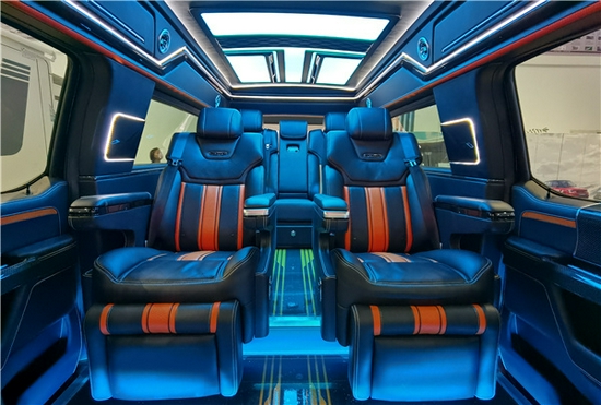 整个后舱铺设了碳纤维水转印镜面地板,给人豪华商务车的感觉。这台车采用2+2+3的七座布局,二排是两个独立的航空座椅,按第三排的配置也是非常的丰富,三排是商务车常见的可一键放的电动沙发床,三排座椅通风加热、四六分段调节,更加舒适。