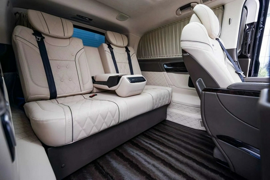奔驰V260鲨鱼T版的车尾比较方正,六边形的后档面积很大,给人很敦实的感觉。而双边共四出的排气和夸张的扩散器,进一步提升了它的性能感,气场丝毫不输丰田埃尔法 (配置|询价)。