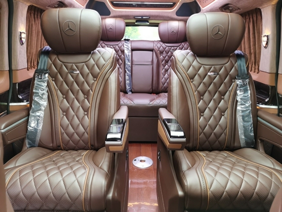 这款奔驰V260的贵宾舱采用的是两两对坐的商务洽谈格局设计,在大尺寸的液晶电视下方,奔驰V260配置了两个可折叠的秘书座椅,可一键电动展开。在两张秘书座椅的中间,是一个小型车内吧台,内置胶囊式咖啡机和一个折叠小桌台,最大限度的利用车内空间,折叠小桌台也可以给车内的商务人士提供一个处理文件以及与客户洽谈的台。