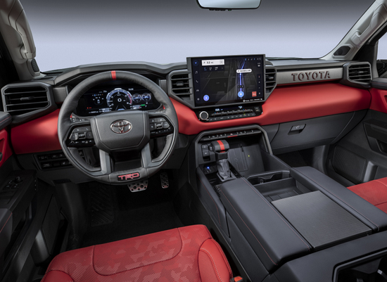 以往丰田皮卡车系列内饰设计确实没什么看点,就像丰田普拉多 (配置|询价)一样,主要以实用为主。但是现在时代变了,年轻消费群体越来越追求科技配置,丰田设计师团队也不得不做出一些改变,这次全新丰田坦途皮卡车内饰科技氛围已经相当强烈了,不仅有全液晶仪表盘加持,而且提供了超大面积悬浮导航屏幕,视觉效果甚至能够媲美特斯拉,TRD高性能版本更是提供了丰富的内饰装饰,比如红色真皮面料座椅,搭配有专属刺绣装饰。