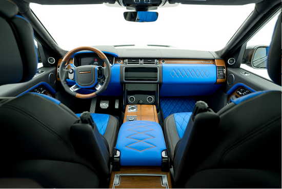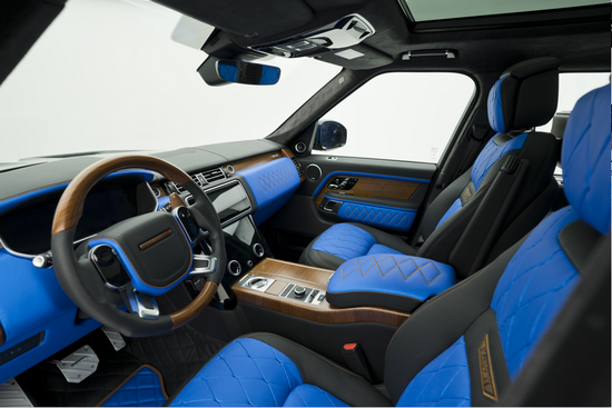 MANSORY Landrover揽胜内饰部分同样吸引人:蓝黑双重配色与车外遥相呼应,实木材料、碳纤维元素、意大利Mastrotto小牛皮、Alcantara环保麂皮绒相辅相成,交混包覆带来的视觉享受直击心灵;椅面菱形纹路细针密缕,奢华典雅显露无余。