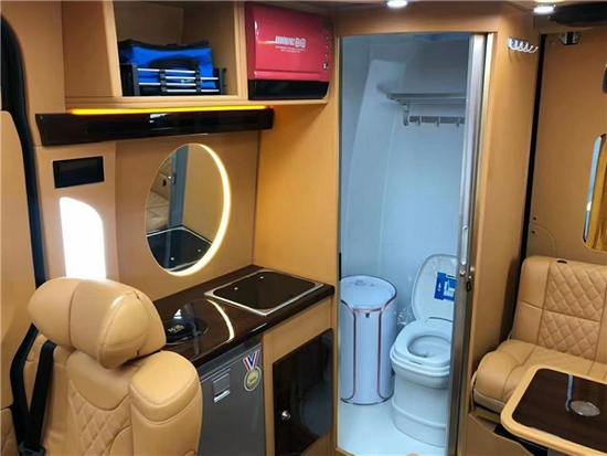 必备的卡座带个小桌子,全部座椅电动调节,三能源冰箱75L,多层橱柜,230v插座。带隔断门的浴室,20L滑轮盒式马桶,230V插座。淋浴间隔水木地板,最主要的这个卫浴,洗手盆不用的时候可以折叠收回去,不占用一点空间。车身采用防腐夹板结构,防冰雹玻璃钢车顶,车体装饰带高级保温隔音层。
