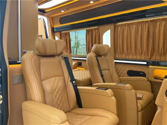 奔驰斯宾特商务房车豪华真皮航空电动按摩座椅,以及高端的科技内饰,能够给车内的商务人士以舒适美妙的乘车感受。电动可旋转按摩座椅,可以自由调节头枕和脚托,肩部、背部、大腿、小腿,按摩部位支持独立控制,5档强度按需调节,全车隐私窗帘,封闭性极好,配有电动隐藏式桌板,一键即可开合,使用非常方便,棕色的两张独立VIP座椅,舒适度五星。且有12向的座椅调节和座椅按摩功能,还贴心的设计了一个宽大柔软的腿拖,让劳累一天的您彻底放松。