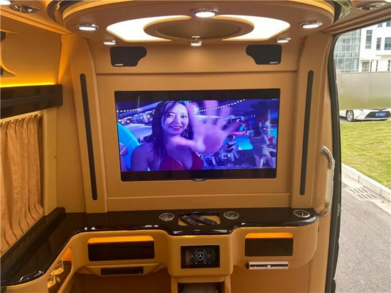 奔驰斯宾特324柴油四驱全车使用了强化隔音降噪材料,制作成经典图案的皮质软包,稳坐车内即可让您安静地大隐于市,闲逸潇洒于繁华都市之间,融入现代家居影音科技,豪华镜面电动升降中隔屏安装了40寸可升降超薄液晶三星电视,配备BOSE5.1声道环绕立体影音系统、索尼DVD播放器,是斯宾特房车价格中少有配备的大型家庭影音系统,商务制胜之道,于宽适中运筹千里。驼色真皮座椅靠背可俯可仰、可前后滑动、可伸展脚托,全方位舒适承托您的身体。