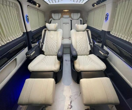 21款奔驰威霆二排航空座椅符合人体工学,具有加热通风、电动按摩、脚托、一键躺、姿势记忆等多种功能,可借由扶手右侧的按键轻松调控,让你一路坐卧间尽享温馨惬意,舒适如家。另配有折叠式小桌板、储物箱、酒水托盘等贴心设施,令你在商谈和休旅间任意切换,自由随心。后排豪华多功能电动真皮沙发椅配有独立腿托,能180度放成一张绵弹舒适的大床供旅途疲乏的乘客闭目安睡。可以说19款奔驰威霆灵活多变的后排结构在与同级车对比中表现突出,市场竞争力之大令人不明觉厉。
