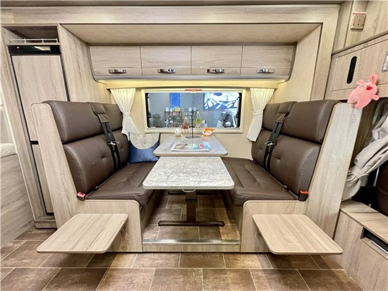会客区由双人对坐沙发与可升降餐桌组成,日常可乘坐3-4人,夜晚则可将餐桌降下,变成一张1900 x945mm的单人床位,增添房车内可休息人员的数量。搭配合适壁外推车窗,在驻车休息时,可以享受微风拂面的畅爽。