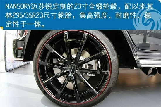 MANSORY为G500定制了四个23吋全锻轮毂,车主可根据喜好选配全黑版或普通版,总体观感比原厂合金轮毂更为精致美观。轮毂中央附带印有“MANSORY”官方LOGO的碳纤维悬浮标,尊贵血统使人不明觉厉。