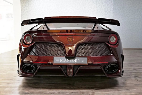 尾部变化更为明显:MANSORY为F12 berlinetta重新设计了排气百叶窗和椭圆形双出排气孔,让它看起来更显“性能范儿”,同时用红线锻造碳重塑了:后保险杠、后置扩散器,尾翼等区域......与原厂相比不仅观感倍增,碳纤维空气动力学组件“质轻于铝,坚稳胜钢”的属性还能有效减小车身自重并降低风阻,继而使得马路上的F12 berlinetta更加安全节能,赛场上的绯色“跃马”难以遇见尾灯!