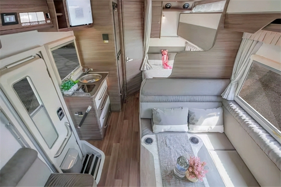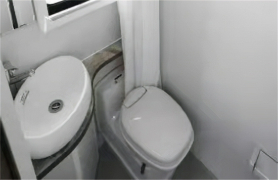卫生间部分比较常规,内部配备赛特福德可旋转式坐便器、洗手池,换气扇及淋浴花洒等。水路系统方面,净水箱容积为180升、灰水箱容积为45升(灰水箱带有手动和自动排水双排水系统),黑水箱容积为18升。