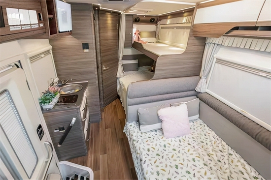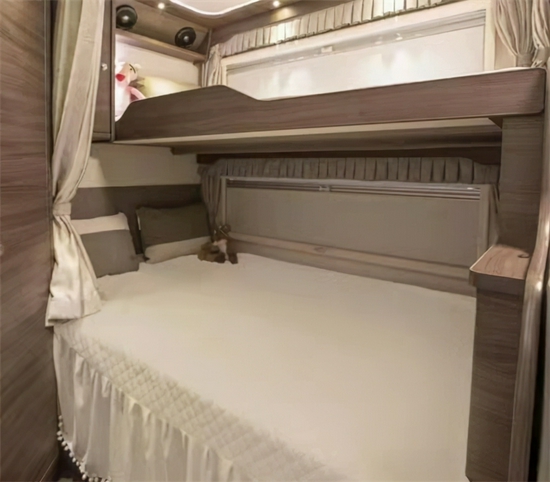 休息区域在我们的尾部纵置床设计为母子床,方便我们进行休息,同时上下窗户也是分离的,不会影响到其他人的休息,床下方我们也是设有储物柜的方便我们存储行李。