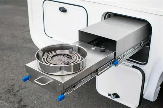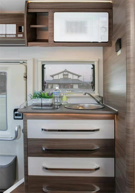 厨房位于中门后方,提供了电磁炉、洗菜池、储物抽屉、英得尔房车专用冰箱等基础设备,车内简单烧水熬粥没问题,煎炒烹炸的话建议还是使用车外的燃气灶。