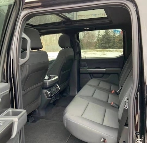 福特F150 白金版 福特猛禽F150皮卡真皮座椅包裹性很强,无论是越野还是长途旅行都很舒服,丝毫不感觉到这大家伙的压抑,二排空间也是十分宽敞,乘坐四个身材高大的乘客绝对没问题。座椅折叠起来可以放一个冰箱,而且门上储物格空间也是够用,虽然不像公羊后排那么豪华,有简易床,但是这种实用的理念就是福特的宗旨。