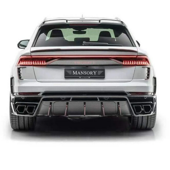 MANSORY对RSQ8侧身部位的改动不似车头那般“大张旗鼓”,但诸如:侧裙、扰流、翼子板护板嵌饰件、后视镜盖等区域也都用被誉为“黑色黄金”的碳纤维材料做了替换升级,令原本单调无华的车身瞬间增添了几分跳跃灵动之气。比较特别的是针对轮眉MANSORY并未使用可视黑碳,而是掺入了与漆面颜色别无二致的“不可视碳纤”,如此操作既确保了车辆整体协调性,又提高了车身易损部位的耐用度,毕竟比铝还轻的碳纤维,强度却要远远高过铁。