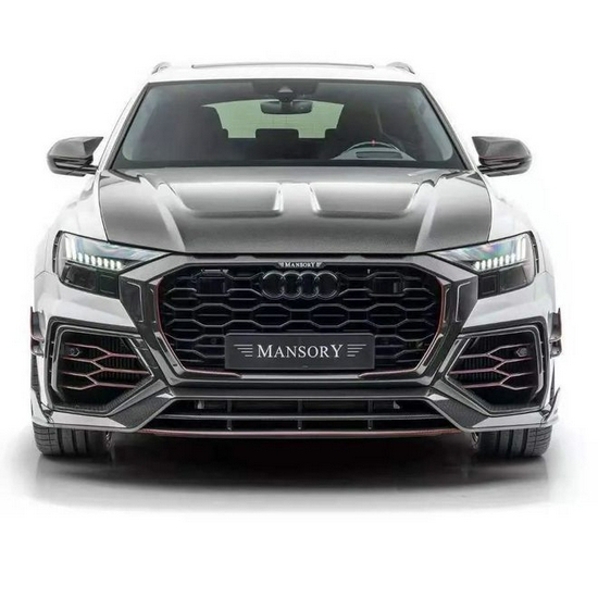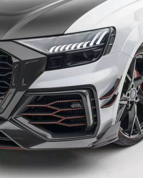 MANSORY为RSQ8重新设计的多边形网状格栅显现出强大的攻击性,搭配肌肉感十足的凌厉线条,一种不输“野牛”Urus (配置|询价)的巨大威慑力跃然于表。MANSORY真爱粉都知道“流水的豪车铁打的碳”这个“梗”,从侧面印证了MANSORY每一次精妙绝伦的个性化定制背后都离不开对碳纤维炉火纯青的运用。RSQ8车头不论是:引擎盖、前唇、前保险杠、格栅框、进气孔薄片、大灯罩等部位都被MANSORY施予 与了大刀阔斧的“碳化”处理。