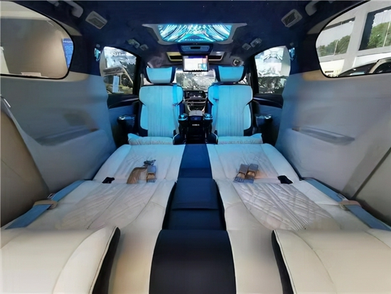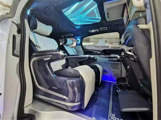 中排座椅采用的是拥有水晶宝座之称的首长级航空座椅,右侧扶手有着相似宝马水晶档把的氛围灯可以64色循环,非常炫酷好看。功能十分齐全,通风加热按摩旋转等等功能应有尽有。地板部分采用的是带有艾维亚印花的亚克力高光镜面地板,档次十足,而且很容易打理。