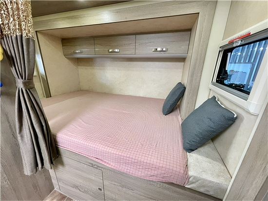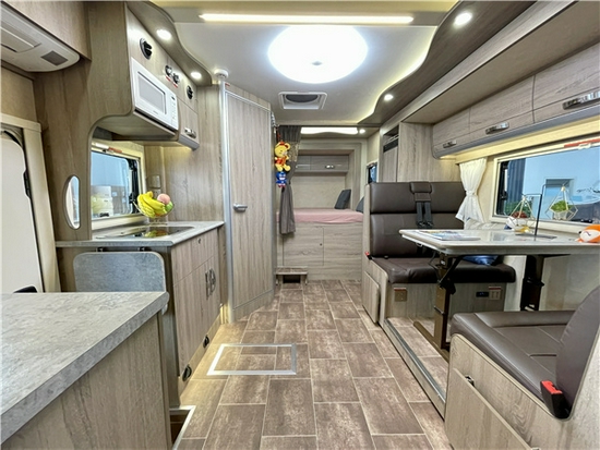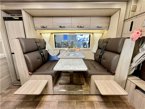 得益于侧拓展的结构,本车的会客区空间很可观,布局上则采用了经典的四人对坐卡座样式,是C型房车中较常见也是车友们较为喜爱的会客区设计,超大外推窗,增加了自然光照入车内的面积,桌面上搭上一块碎花桌布,阳光照耀,摆上下午茶点心,颇有美式田园生活的感觉;座椅的上方有丰富的储物空间。升降桌降下与对坐沙发可以拼成一张1900*945(mm)的临时床位。
