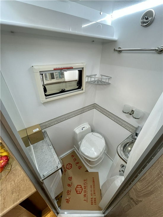 一体式洗手间空间非常充裕。集多种功能一体,拥有马桶,水龙头,洗脸盆,淋浴,浴镜,烘干机,晾衣绳,浴灯,换气扇。配置齐全,而洗衣机设计在卫生间确实更加合理,不会把水弄的哪都是,烘干机也是很实用的设计,在野外的时候把衣服挂在外面容易弄脏,挂在卫生间更加干净,烘干机一开,干的也快。