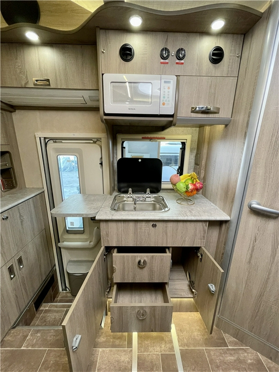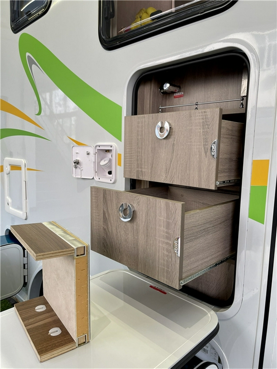 厨房区没有配备内嵌式电磁炉,目前市场上房车专用的内嵌式电磁炉尺寸太小,损坏后不容易更换,所以我们采用的是便携式小米米家智能电磁炉,还能用来在会客厅吃火锅、配备的还有松下微波炉和多个储物柜,可在室内做点简餐,也可与室外厨房配合使用,享受露营野餐的乐趣。当然出门旅行的时候也可以自带充足的食材和饮品,152L的塞特福德冰箱完全放得下,冷藏冷冻均可。厨房区最上方配备卡洛西行车空调,上门处上方配备的是三菱重工的1.5P变频空调,厨房区最下方是伟巴斯特柴油热水暖风一体机。带来舒适适宜的生活环境。