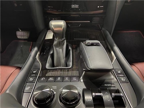 21款雷克萨斯570黑曜版中控台及仪表台上方的材质为软性真皮包裹,材质优越,按键及按钮手感好。仪表盘和音响系统控制面板遵循LX的未来设计风格,呈现简洁与易操作的特点。四幅多功能方向盘样式显得很稳重,排档杆面板及行驶模式控制面板都呈现厚实的金属感。