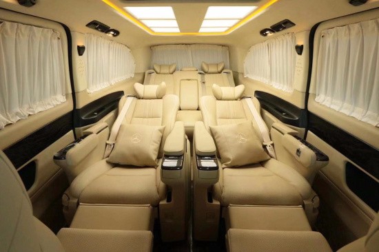 奔驰全新V260第二排座椅可360度旋转,安装桌板后俨然变身为一个移动会客室,空间私密。第三排座椅可放,配合第二排座椅旋转,俨然成为一张约4尺的大床,在您旅途中可适当的休息;可谓是人性化十足。