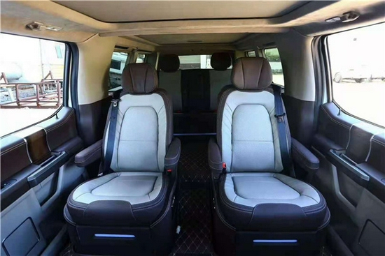 3排采用的是沙发床,通过中央扶手可进行靠背调节,可以进行180°放平。 这款顶部的设计偏素,除了前方全景大天窗之外就用了蓝色线条氛围灯,当然老板们可以自由发挥,可加装各类顶灯。