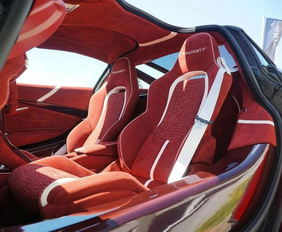 在MANSORY传统内饰工艺加持之之下,McLaren 720S内部座舱获得了更为宽敞雍容的空间格局:全车精选殷红色Mastrotto小牛皮、Alcantara环保麂皮绒包覆座椅、地毯、内壁以及中控面板、方向盘、扶手箱、顶棚等区域,并用大量碳纤维饰件加以点缀,由此极大增强了内舱富丽尊荣氛围和时尚运动属性。