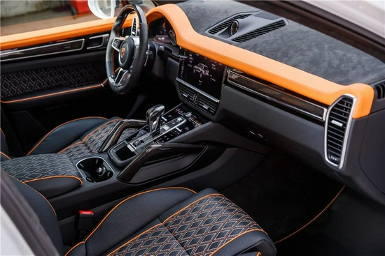 MANSORY精益求精的内饰工艺自品牌1989年创立以来便从未让车迷们失望过。这款细花白卡宴自然也不例外:全车皮料精选Mastrotto小牛皮,12.8万针数控编织工艺密针细缕,座椅椅面、扶手箱、门板等处缝制橙色菱形网格纹路,带来华丽跳跃视觉效果的同时让人恍若置身激情泗射的赛车空间。