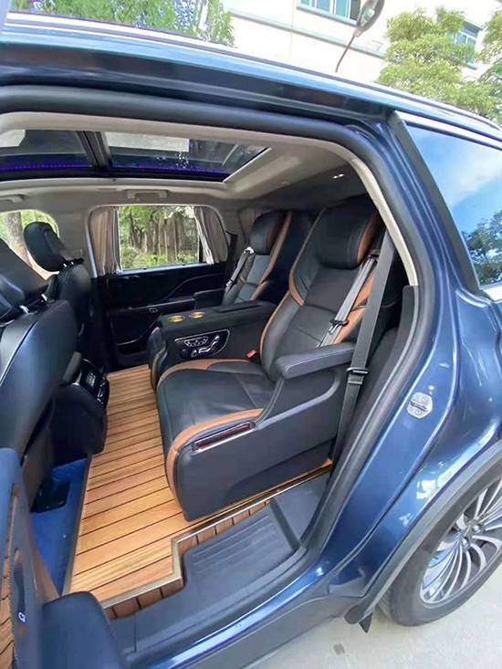 除了林肯独特的风格之外还拥有非常高的舒适度,这台升级过后的飞行家(原车座椅升级)拥有比同级别的车型更好的舒适度,中排的两张航空座椅就像是两张大沙发一样,宽阔的靠背能把人的背部整个包裹起来。