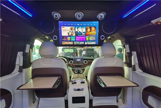 奔驰V260L改装商务车后排三座采用的是电动三连坐沙发座椅,支持电动一键躺,座椅变大床只需要一秒。后舱为了照顾到没有像全隔断设计那样较好的私密性,V250设计了电动遮光窗帘,让整个空间能够不被外界轻易看到。