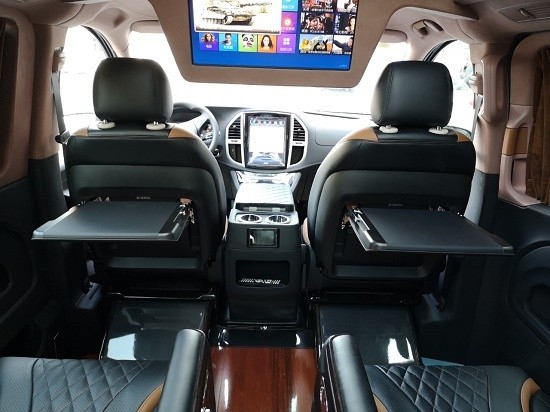 后排座椅采用的是德国进口座椅,带电动、加热、按摩、通风功能的航空级首长席,可沿着地面上滑轨实现前后延伸、旋转对坐,对于这种智能化的乘坐体验,也是原厂车型望尘莫及的。九宫格顶灯,虽然加装高顶体现出奔驰威霆改装的豪华MPV。