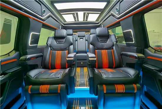 内饰我们采用碳纤皮质材料让我们的豪华性以及舒适感得到提升,并且橙黑的双拼设计符合大多数朋友的审美观;二排座椅也是运用航空座椅,为我们带来舒适的乘坐感受,以及碳纤木质地板以及真皮包覆让我们后排的奢华性得到等好的展现,驾驶座椅后上方配有半隔断电视搭配索尼音箱为我们带来了优质的视听感受顶部的氛围灯光进一步提升内部空间的氛围感。