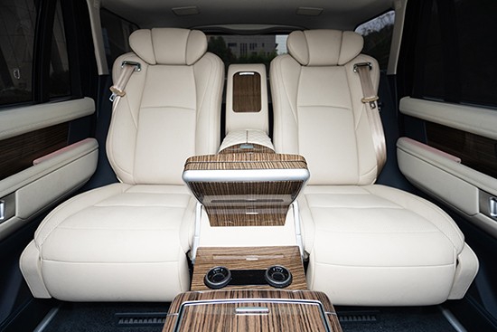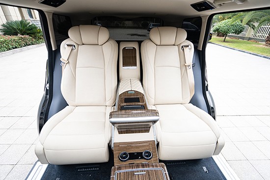 今天介绍的是揽胜加长四座版本,后排座椅经过后期升级完成,原车是五座的,升级后完全变成了老板专用座,后排和前排一样变为可调节、而且因为加长款的腿部空间宽阔所以座椅带的电动腿托也完全可以使用,调节功能共有六项、分别是电动靠背、电动腿托、电动前后移动功能。除了是无损安装外,风格上和揽胜也是完美搭配。