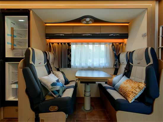 配备仿真皮包覆四座沙发座椅搭配进口可升降餐桌,降低后这个地方可以拼接为一个床铺,可容纳一名儿童休息。座椅后配备152L进口车载冰箱,可满足旅途新鲜蔬菜的储备。