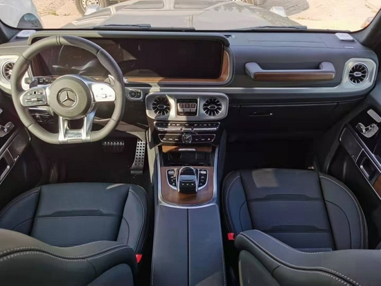 21款奔驰G63 (配置|询价)内饰方面其实才全新一代G级 (配置|询价)最大的变化。新车换上了奔驰最新家族式的内饰设计,这无疑让G级拥有了旗舰机应有的豪华感,不过经典的副驾驶席扶手和三把锁的开关键依旧延续了经典设计,并设置在中控台最显眼的位置。其中双12.3英寸高清屏,虚拟仪表盘与中控液晶屏融为一体,视觉上形成一个宽屏驾驶舱,中部的涡扇式空调出风口也颇具设计感,还大量采用了皮革的包覆。