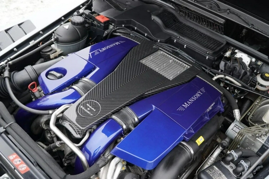 掀起引擎盖,你可以找到隐藏的5.5T V8 双涡轮增压发动机。水箱罩、油箱盖等区域皆用碳纤维材料打造,提高整体视觉效果的同时也提升了发动机整体散热能力;左右分布的MANSORY官方logo完美展现了这台越野“巨兽”的尊奢血统;在MANSORY动力部门调校下, 原厂AMG G63 6 x 6更大功率飙升至544PS,更大扭矩提高到760N·m;配合7速手自一体变速箱,这台六轮“巨兽”0—100km/h加速成绩被完美控制在了6秒以内。