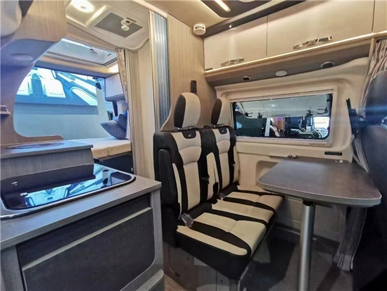 室内设计方面,作为瑞弗房车首款B级房车来说,室内色彩搭配非常不错,能给人一种耳目一新的感觉。驾驶室上方配备大尺寸钢化玻璃天窗,带有遮阳帘和防蚊帘。更为人性化的是,前挡风玻璃和驾驶室两个侧窗采用进口遮阳帘配件镶嵌。驾驶室只有副驾驶席可以享受旋转,紧接着生活区客厅部分采用双人单排座椅布置,带有可延伸的餐桌,可以形成一个3人简易会客区。18017751185