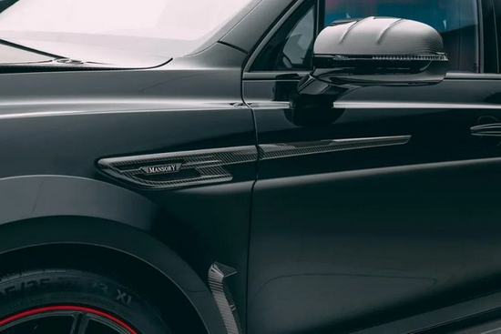 车头引擎盖用MANSORY自家高温热压技术打造而成的碳纤维做了替换升级,观感与周身曜黑涂装相仿但细细端详却又能发现明显的“质感”差异。“更立体动感,更层次分明”是观者对MANSORY添越的初印象。除此之外,诸如:前唇、前/后保险杠、中网格栅、日行灯罩、翼子板、侧裙、扰流、后视镜壳、尾翼、后置扩散器等部位也都一一换成了碳纤维材料。碳纤维所具有的:轻量、坚固、耐高温、抗拉伸等优良属性让车身自重得以降低,提高燃油利用率的同时,机盖散热效率和全车安全系数也获得了显著提升。