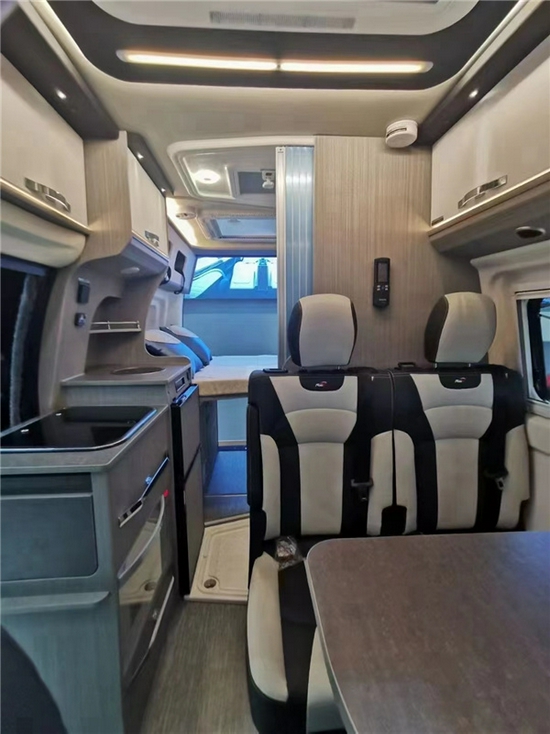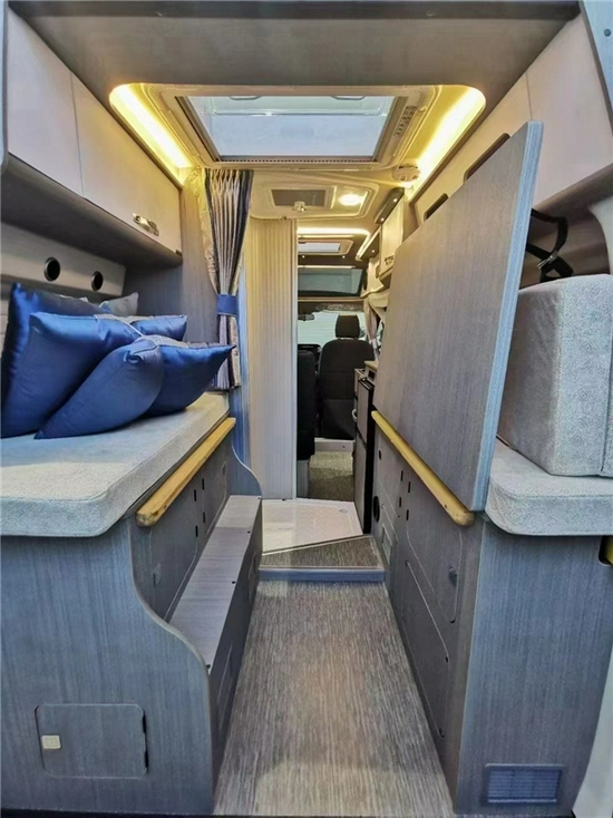 室内设计方面,作为瑞弗房车首款B级房车来说,室内色彩搭配非常不错,能给人一种耳目一新的感觉。驾驶室上方配备大尺寸钢化玻璃天窗,带有遮阳帘和防蚊帘。更为人性化的是,前挡风玻璃和驾驶室两个侧窗采用进口遮阳帘配件镶嵌。驾驶室只有副驾驶席可以享受旋转,紧接着生活区客厅部分采用双人单排座椅布置,带有可延伸的餐桌,可以形成一个3人简易会客区。18017751185