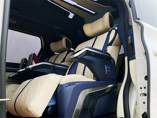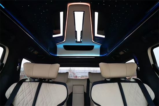 传祺M8高顶定制款极夜之光贵宾舱内饰采用时尚的蓝白双拼配色加高亮光定制装饰,NAPA工艺包覆加上桃木点缀,更加的有质感; 搭配高级音响系统,8个扬声器+1个低音炮,当你乘坐在这样奢华内饰的商务车里,打开专属的独立影像系统,想想都非常的惬意。