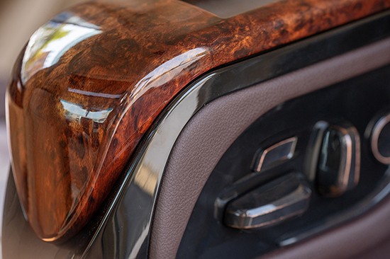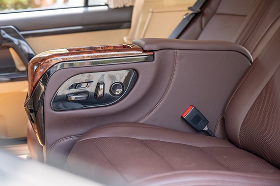 中央扶手箱细节图——由桃木和纳帕皮还有模具组成,市面上大部分航空座椅的中央扶手都是用木头做木工造型做成的,非常拉低档次而且很重,里面有可能还会蛀虫,这种是不可取的,高档的改装件使用的都是模具扶手,材料和汽车中控台使用的塑胶件一模一样,这个大家要分清不要乱用。