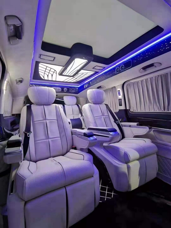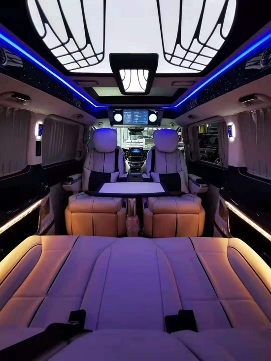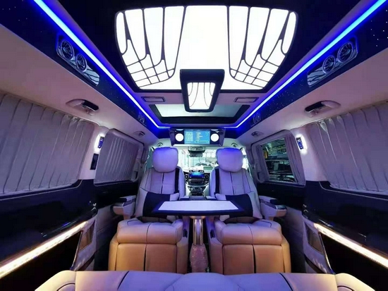 进入后舱我们首先看到的是上半隔断的24寸高清电视,让我们的乘坐人员不会那么枯燥无味,下面安装的是隐藏式折叠桌板,商业精英的移动办公之地,高顶上面前是一个大天窗后面加装宫格式顶灯搭配周围多色氛围灯,2020款奔驰V260L改装商务车2.0T是一款改装潜力特别强的商务车,能够商务,能够接待,能够出门游玩等。