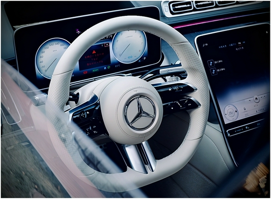 试驾车辆配备了全新样式的AMG line样式方向盘,白色Nappa皮质包裹带来了细腻的手感,为了配合自动辅助驾驶系统,方向盘还配有电容式传感器,可以检测驾驶员的双手是否保持在方向盘上。